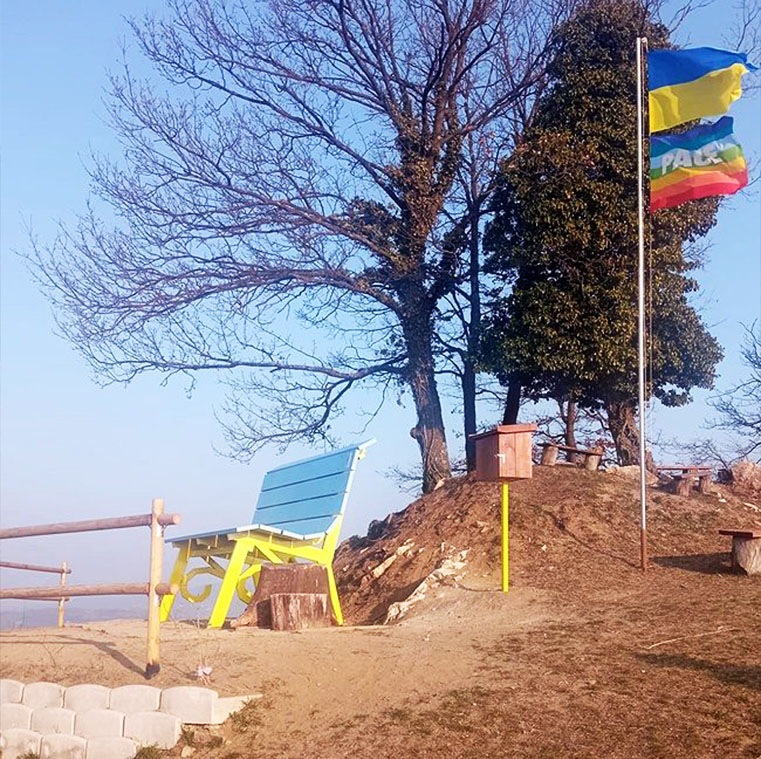 la zona è inoltre disseminata di panchine giganti colorate e percorsi trekking per raggiungerle. (ne abbiamo una molto vicina- Panchina Gigante di San cassiano gialla e blu)